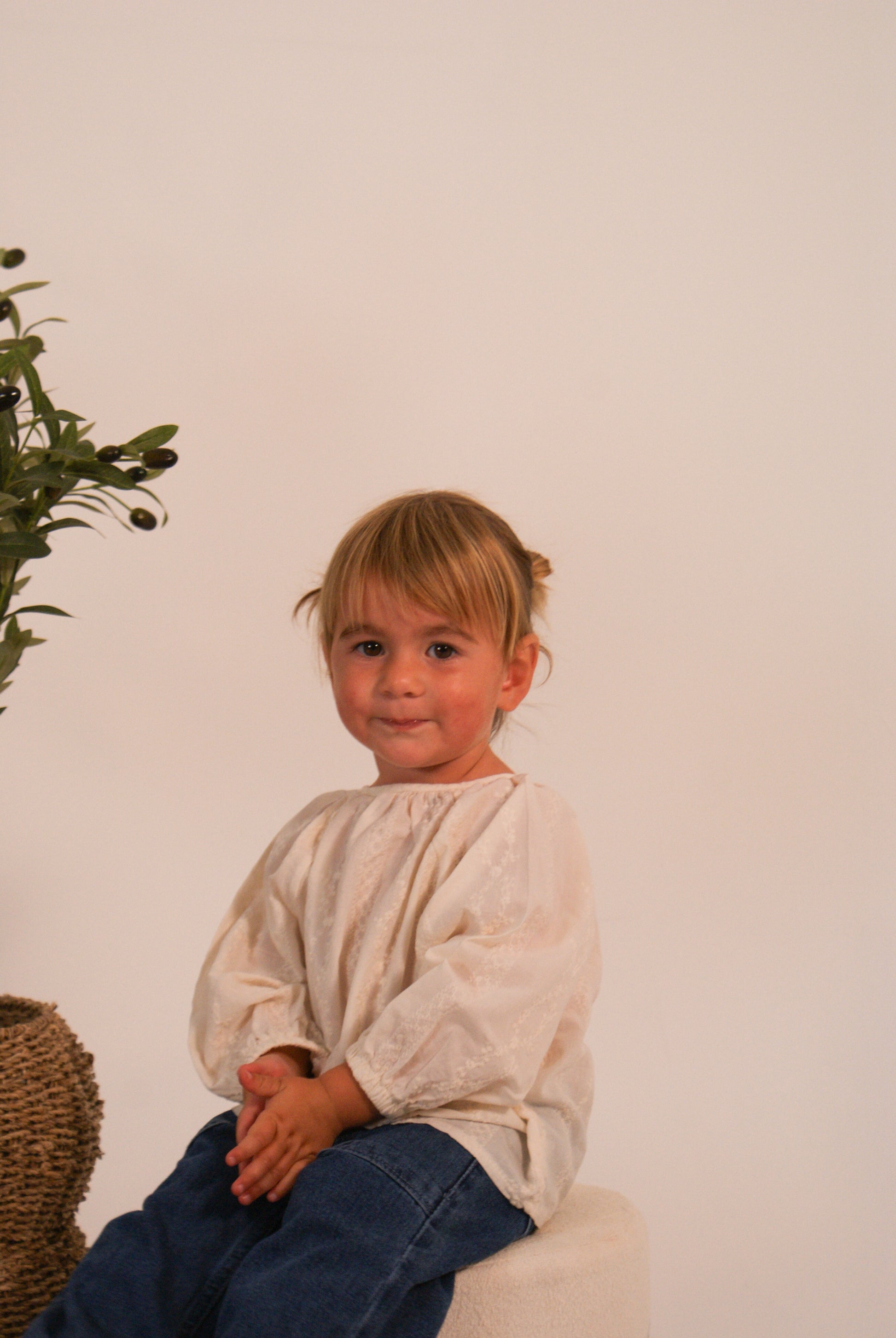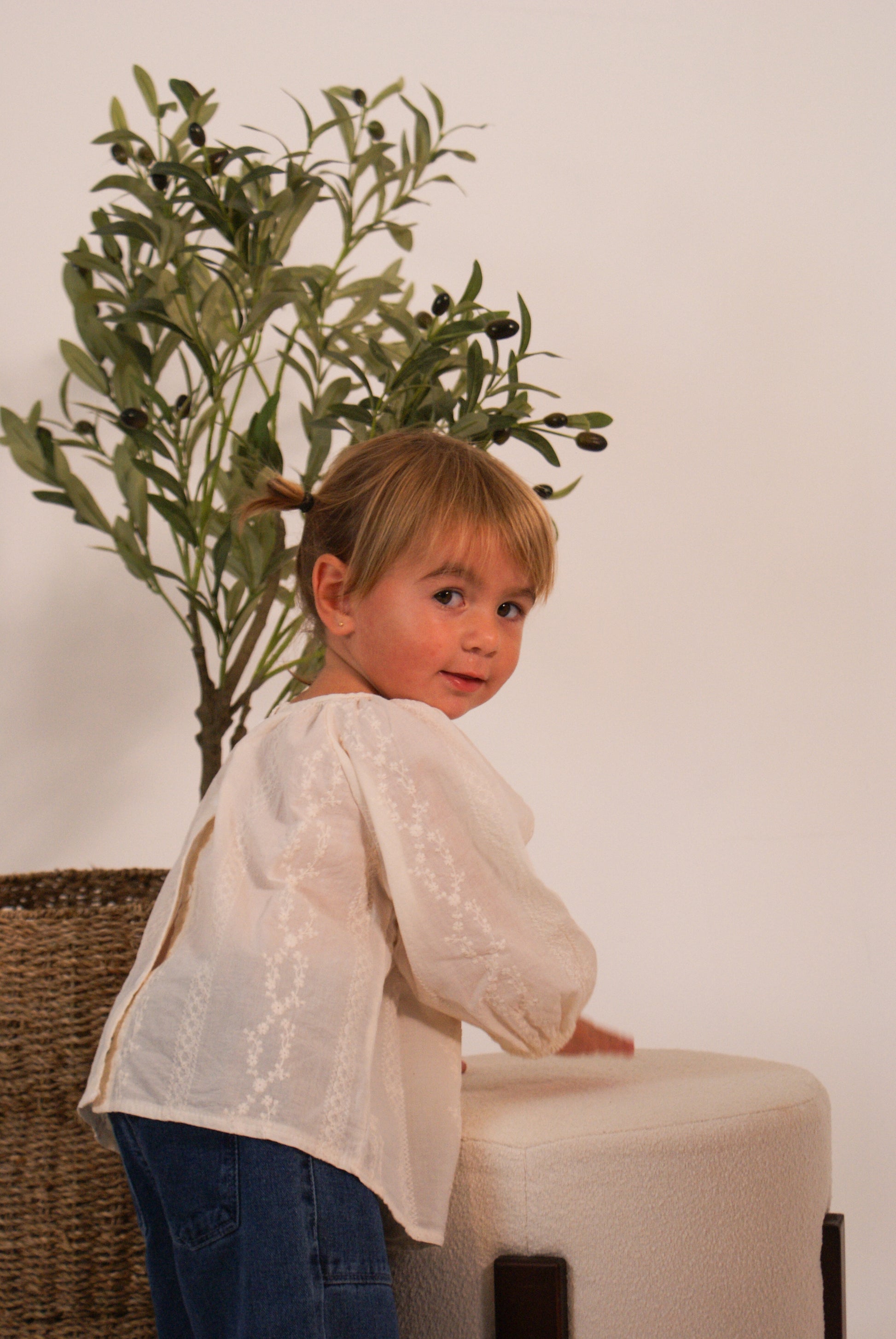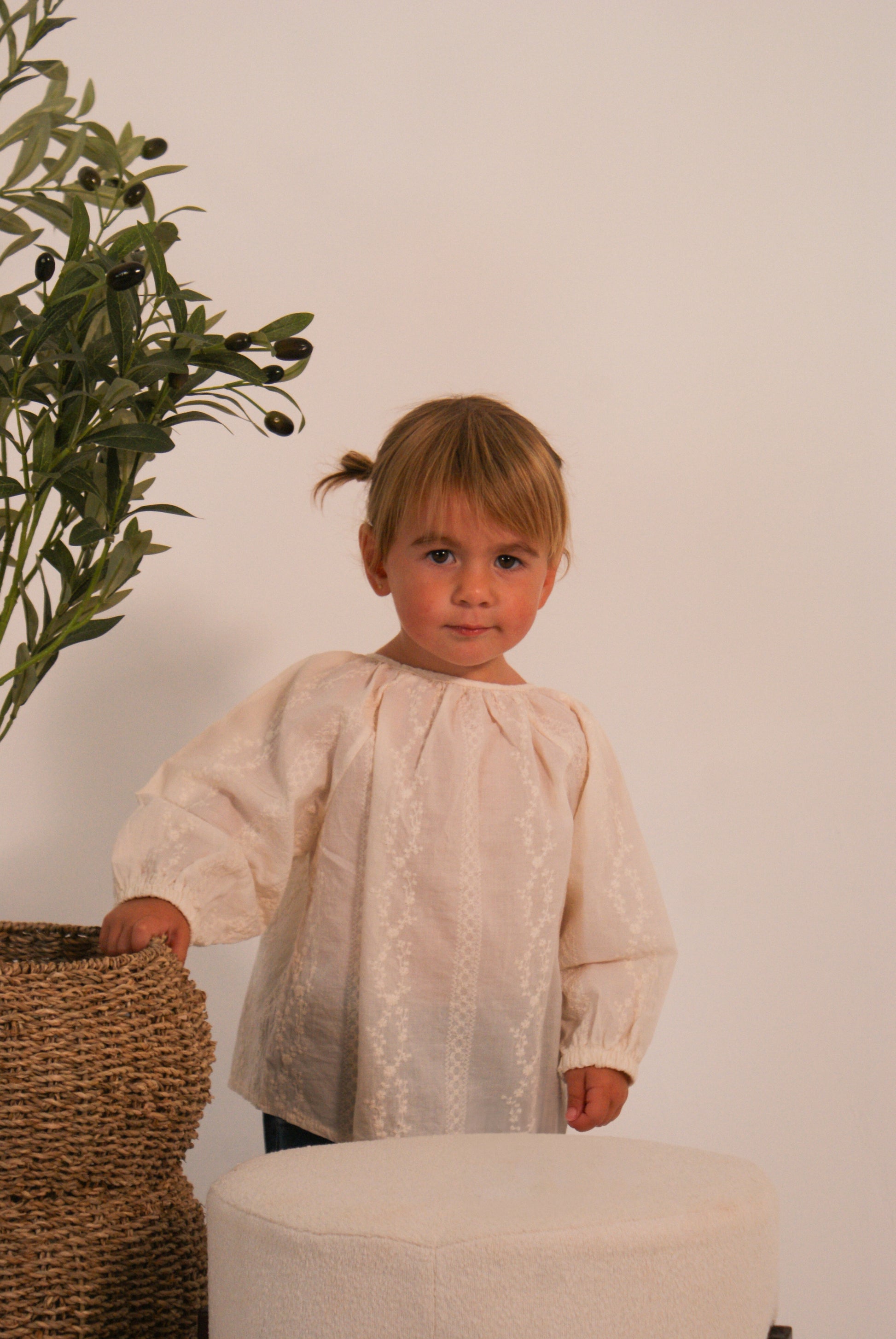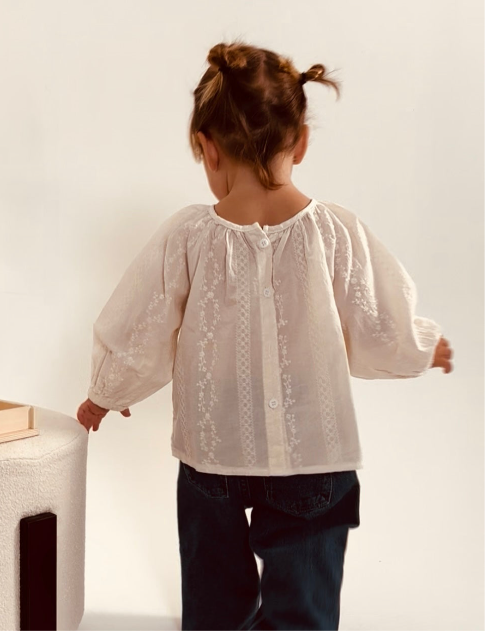Chemisier léger avec broderies délicates. Manches longues légèrement bouffantes et boutonnage sur le devant. Idéal pour un look doux et élégant.