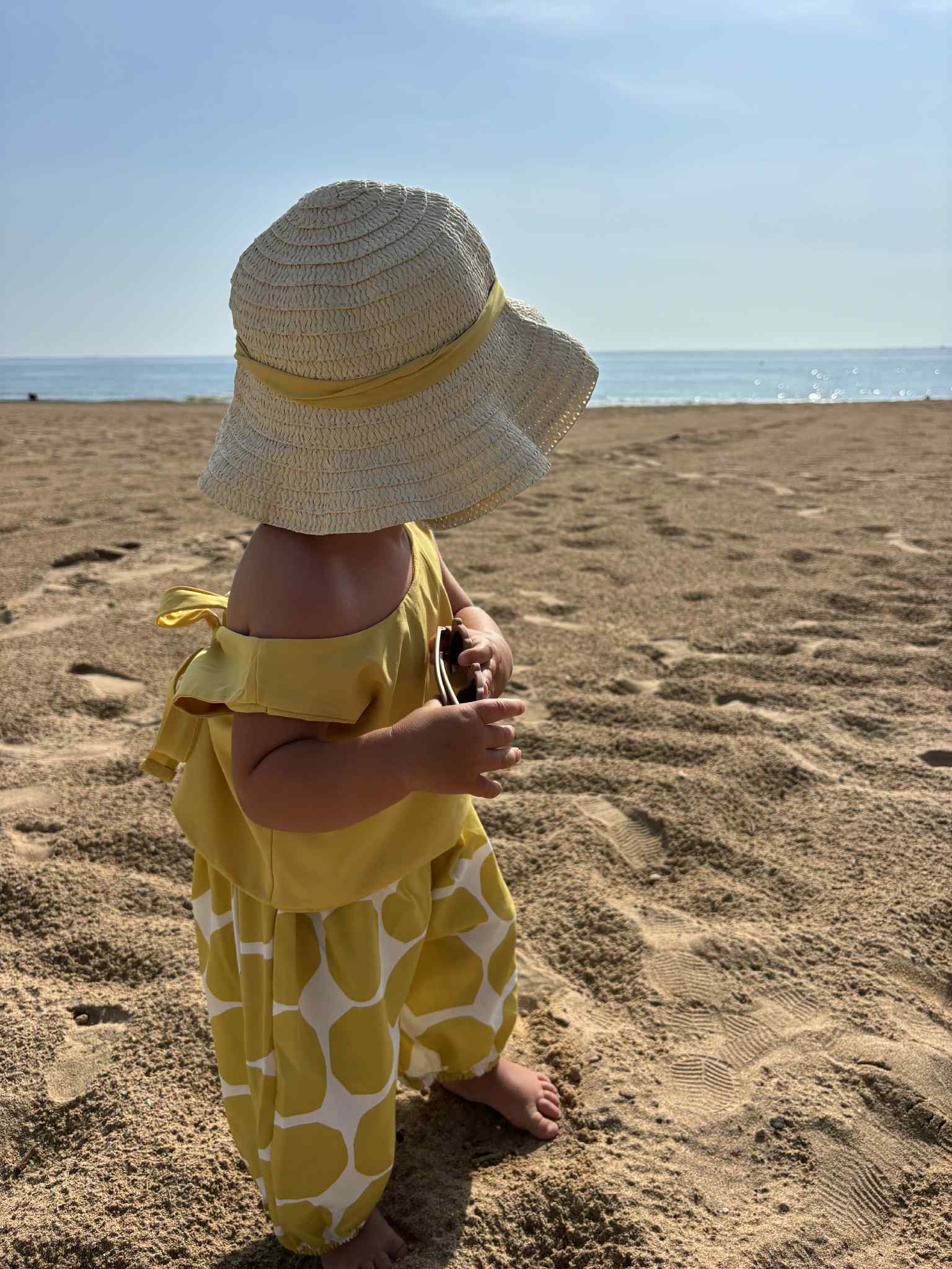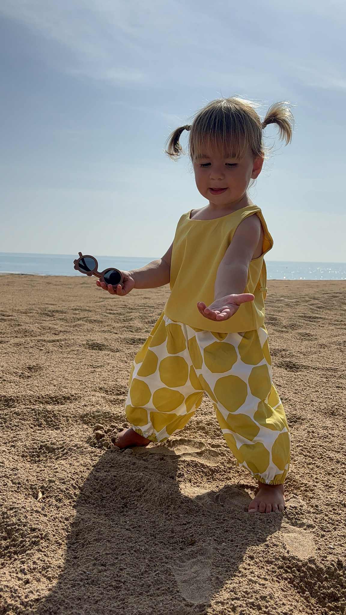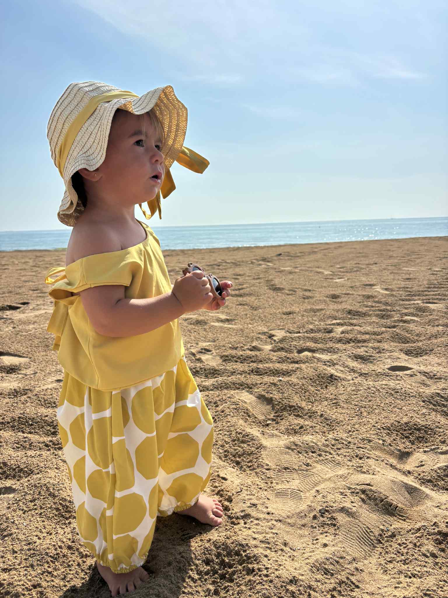 Cet ensemble 3 pièces lumineux apportera une touche de soleil à la garde-robe des petites filles. Composé d’un haut épaules dénudées jaune, d’un pantalon bouffant à motifs géométriques et d’un chapeau assorti, il est aussi confortable que stylé. Idéal pour l’été, la plage ou une sortie en famille !