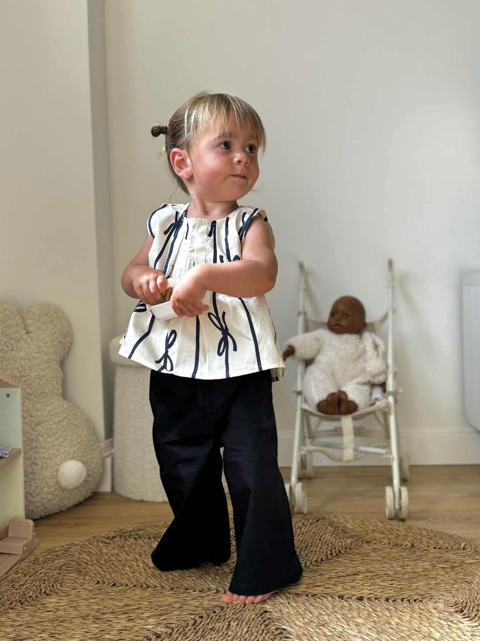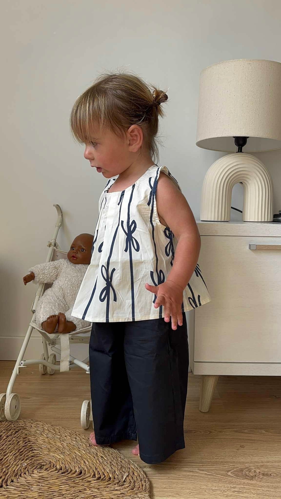 Chic et raffiné, l’ensemble Duo Ruban Marin associe un haut sans manches blanc orné de petits nœuds bleu marine à un pantalon légèrement évasé bleu marine. Une petite attache délicate avec bouton au niveau de la nuque vient parfaire ce haut élégant. Un look parfait pour les petites filles qui aiment allier confort et style avec une touche de charme intemporel.