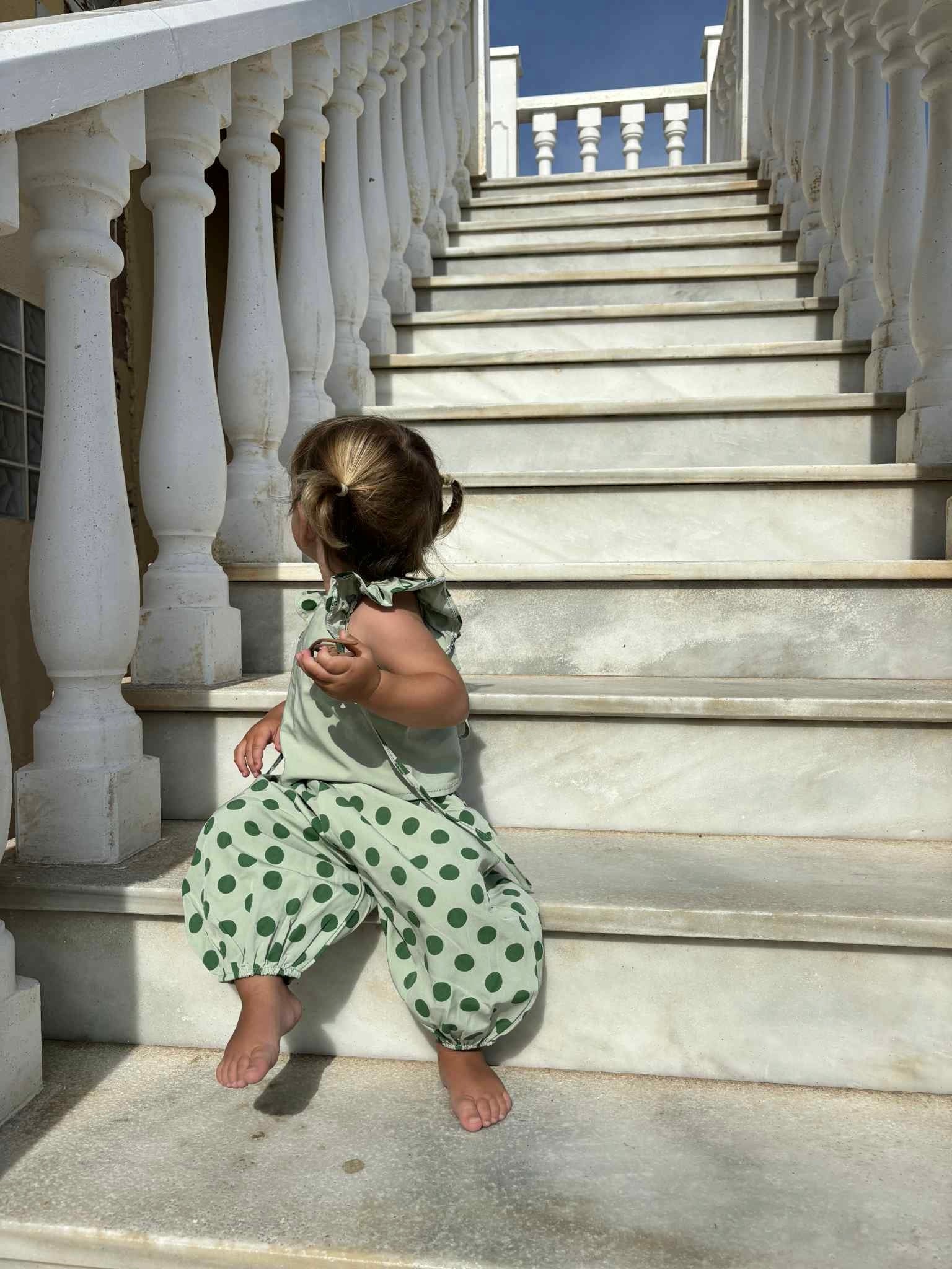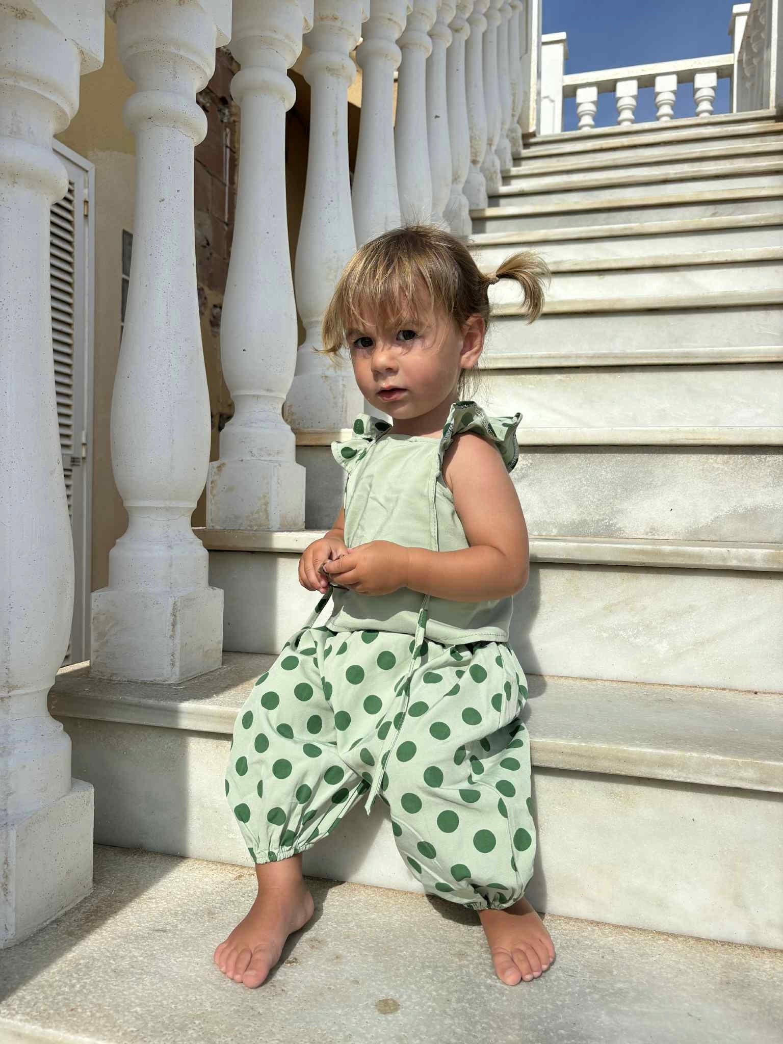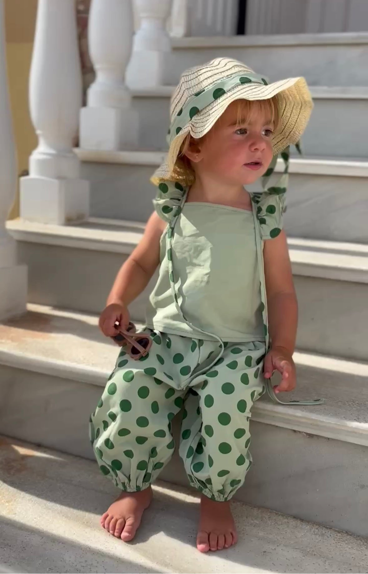 Cet ensemble 3 pièces pour bébé fille est un concentré de fraîcheur et de style ! Composé d’un débardeur vert clair, d’un pantalon bouffant à pois verts et d’un chapeau assorti, il est idéal pour les journées d’été. Léger, confortable et ultra mignon, il offre un look à la fois tendance et pratique.
