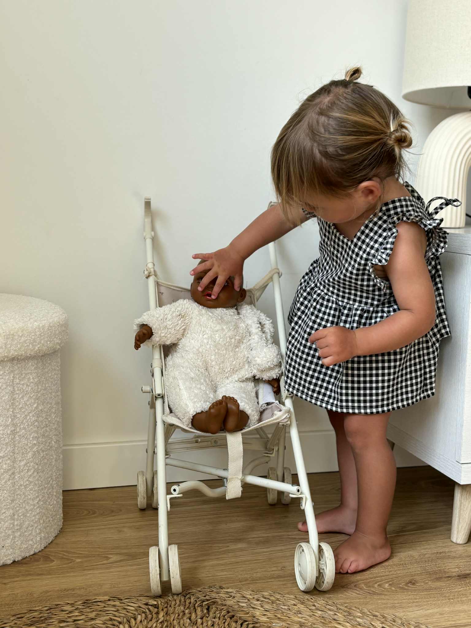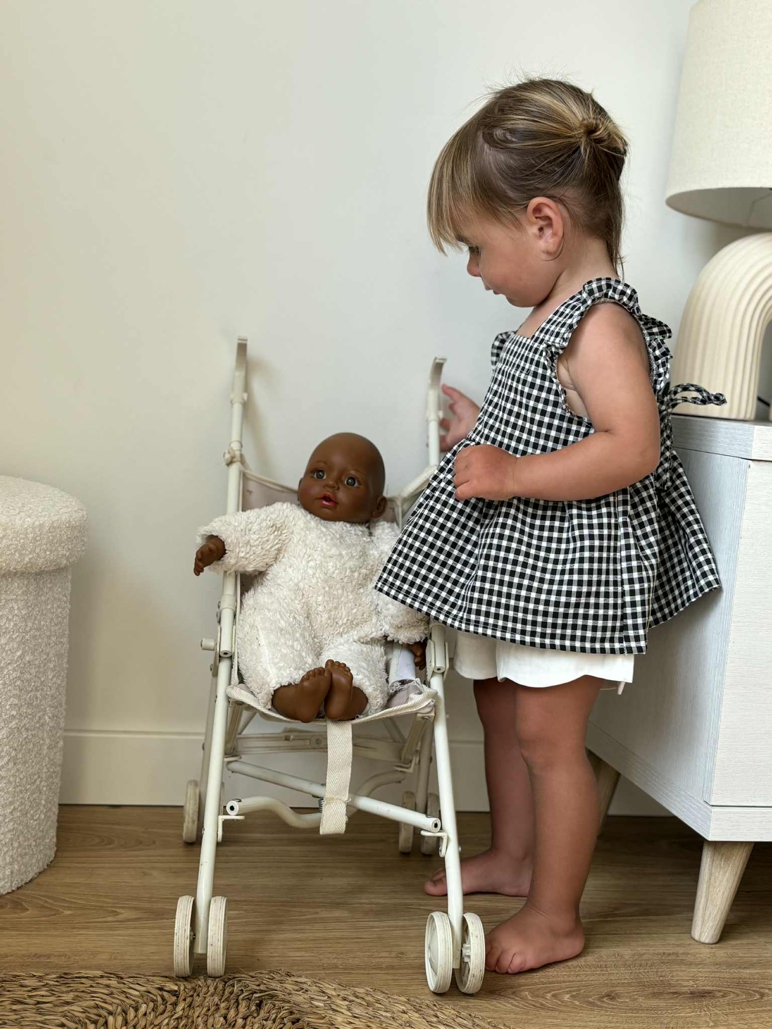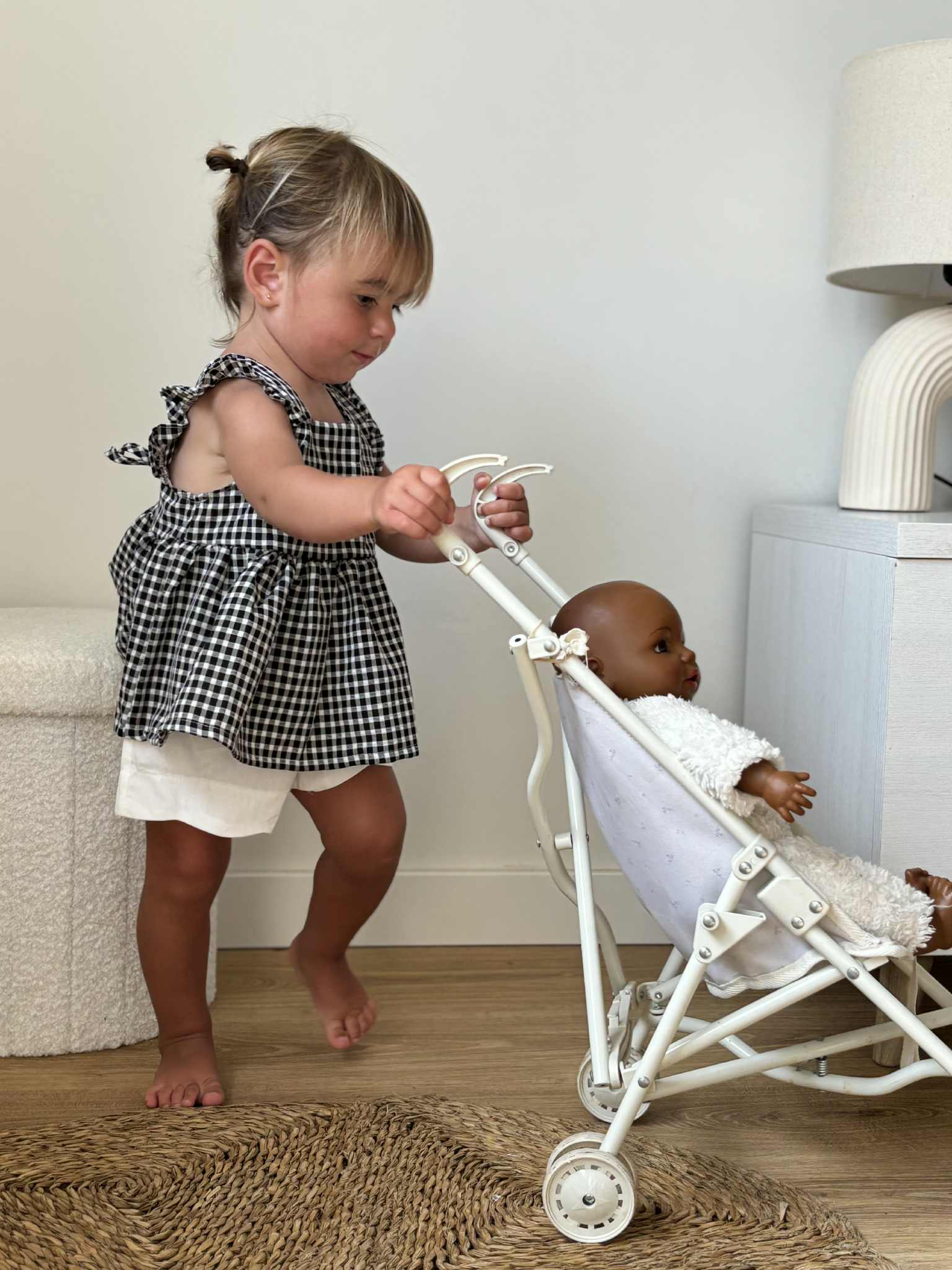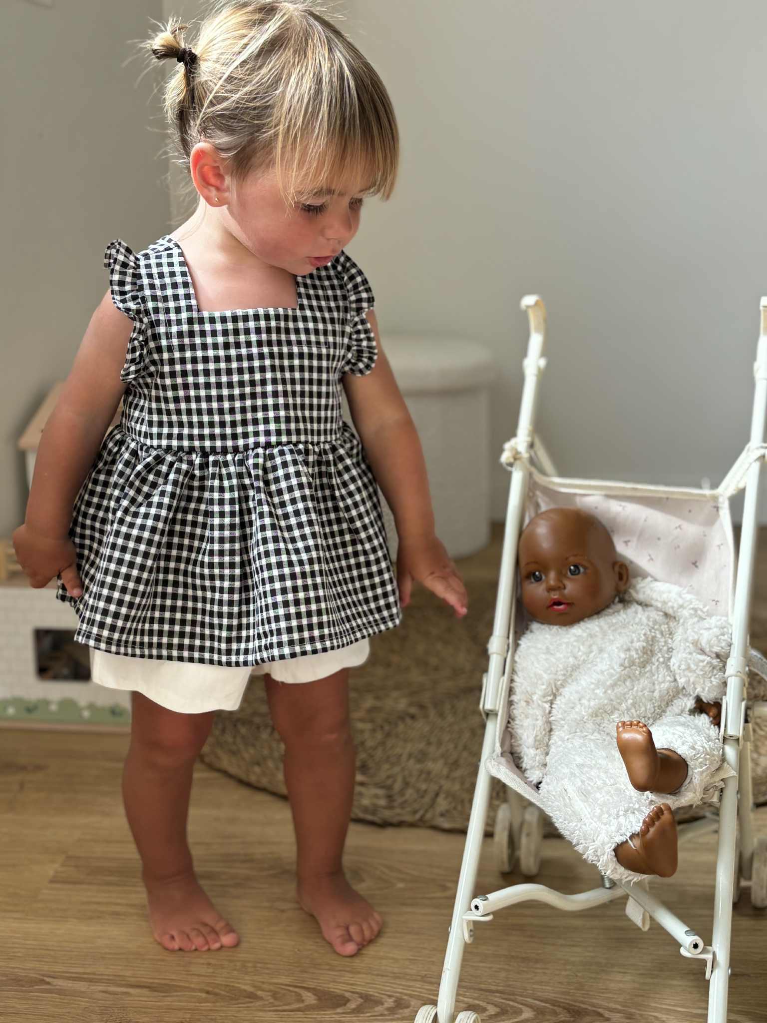 Léger et plein de charme, cet ensemble quadrillé noir est idéal pour les journées ensoleillées. Il se compose d’une blouse façon robe courte, ornée de jolis nœuds à nouer dans le dos, associée à un short blanc fluide, parfait pour laisser la peau respirer. Un look à la fois chic et décontracté, pour des petites filles toujours à l’aise.
