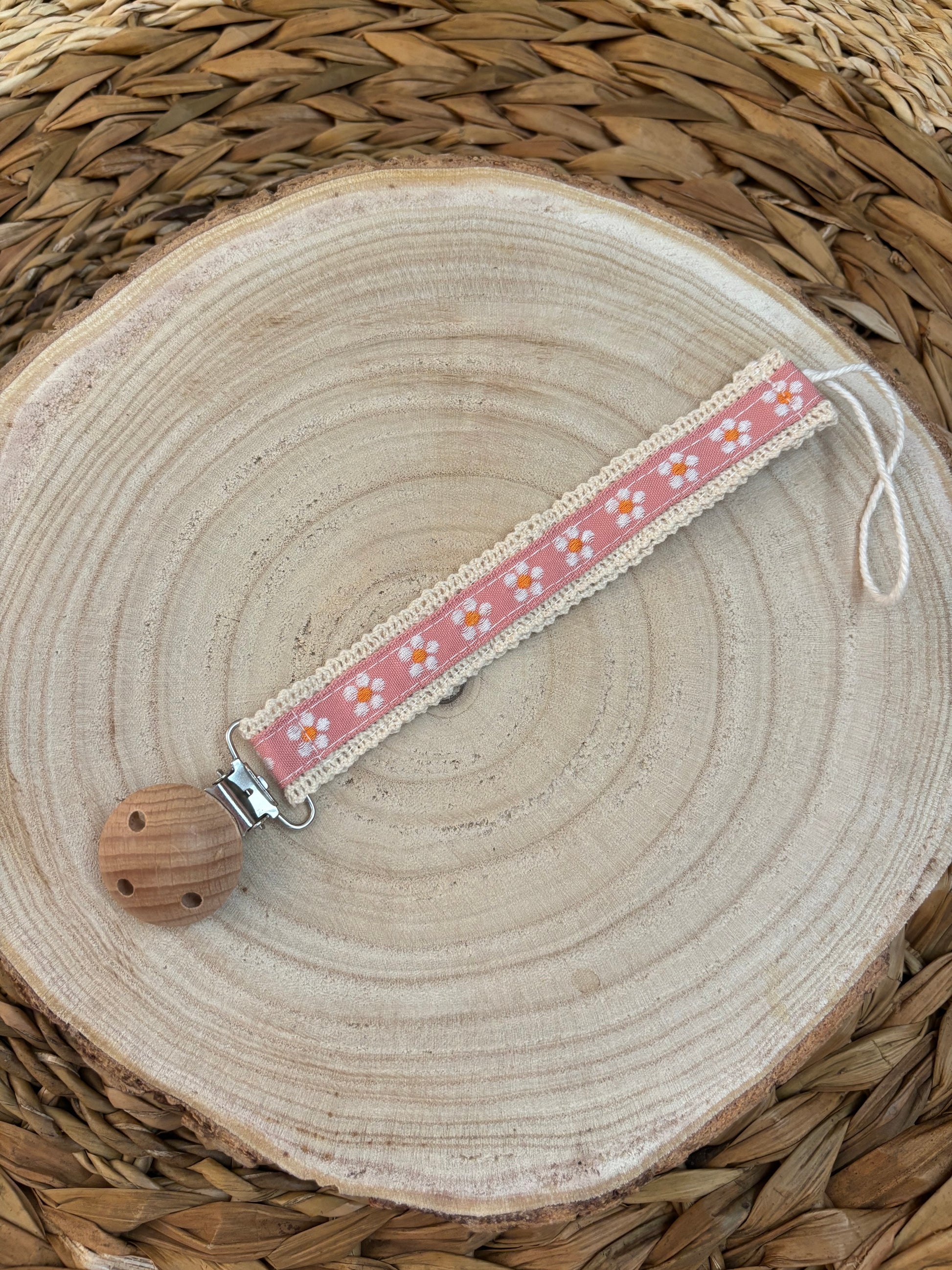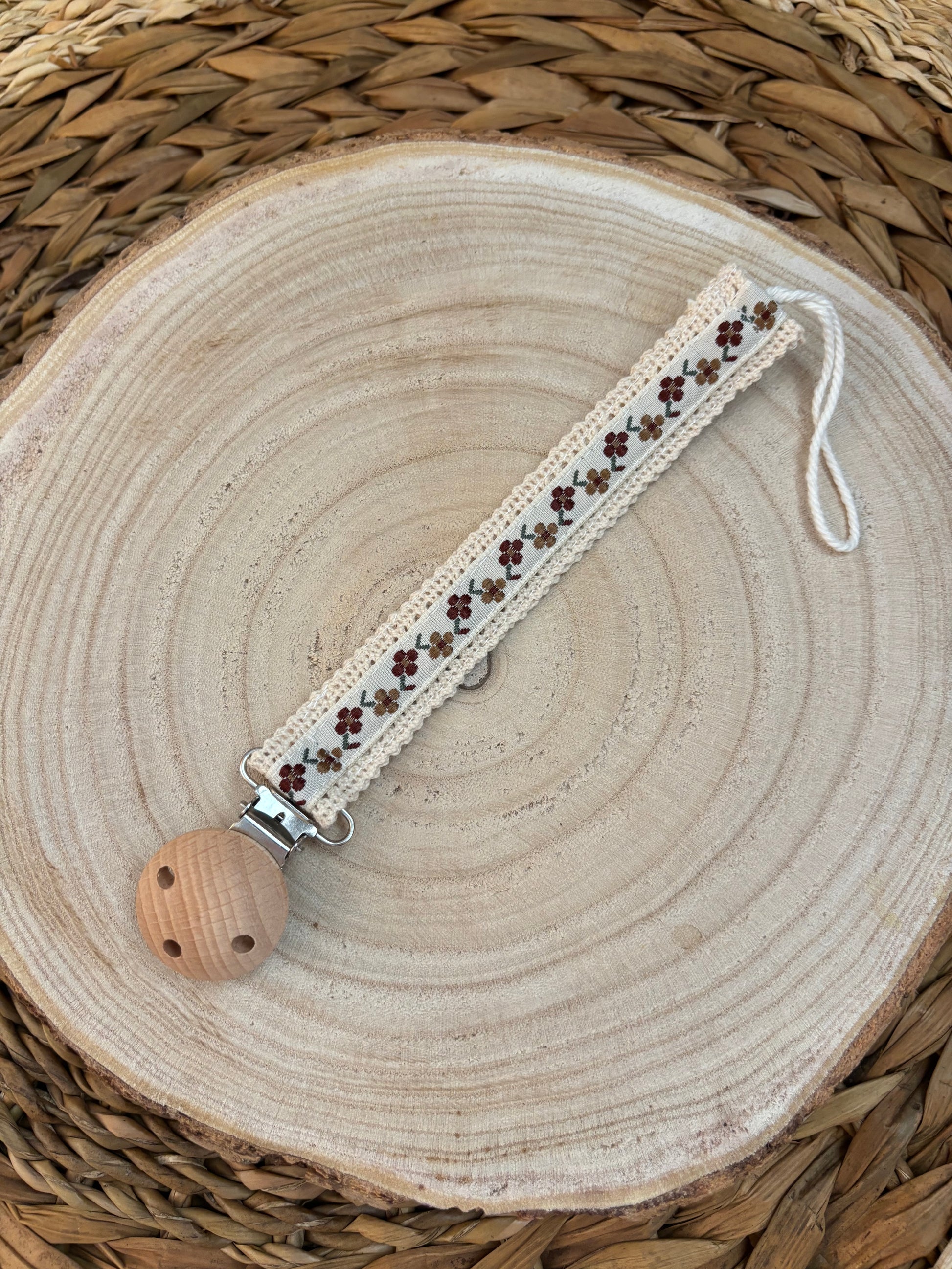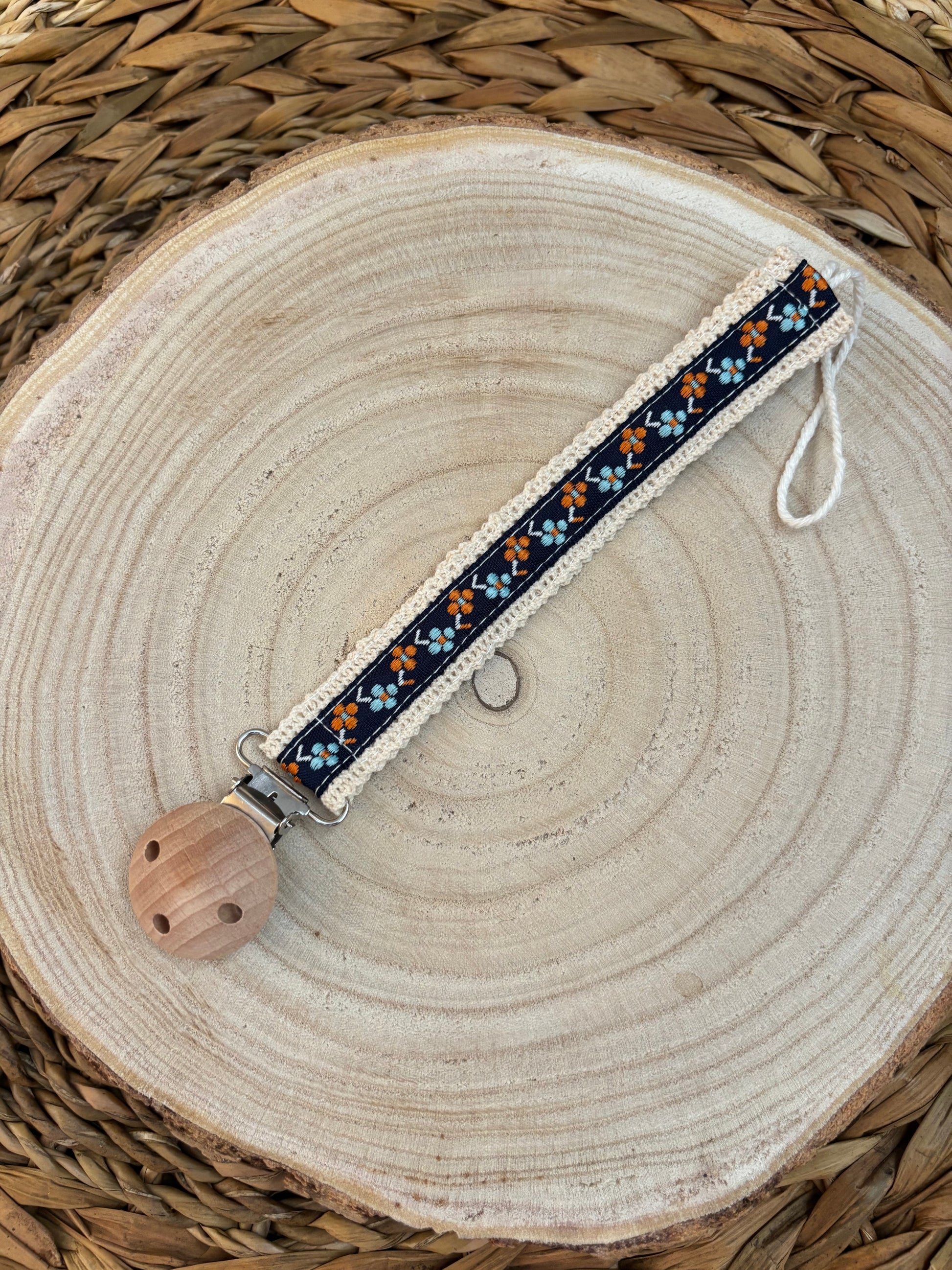 Attache-tétine en bois & ruban jacquard