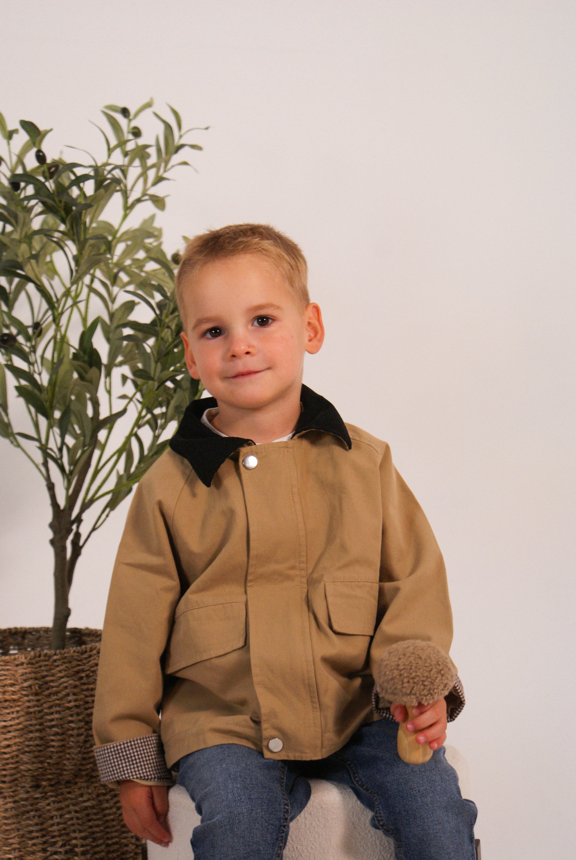 Veste mi-saison, coupe droite. Fermeture zippée et pression, col en velours noir, manches retroussables avec doublure à carreaux. Deux grandes poches à rabat à l’avant.